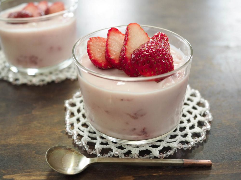 いちごをフォークでつぶし、ヨーグルトに混ぜて作るゼリーです。いちごをフォークでつぶすのが、なんとも言えず、楽しい♪昔のイチゴはすっぱかったからね。つぶして砂糖を混ぜて、牛乳を入れて食べたりしたものです(これを知っている人は、私と同年代♪)。それを思い出しながら作ってみてください。生クリーム不要です。安いいちごで作れます!!