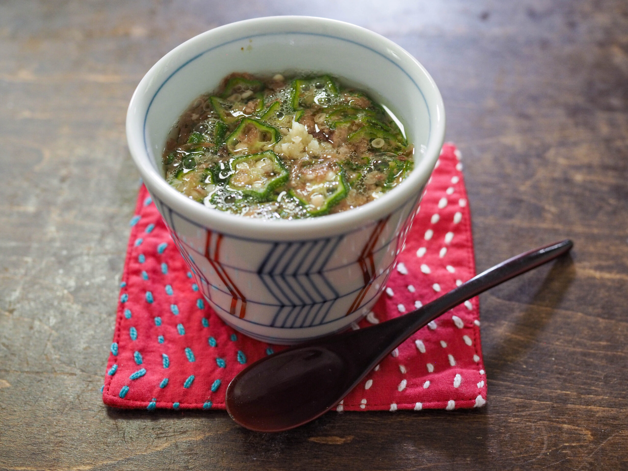器に、オクラおかか漬け(適量)と味噌を入れ、お湯を注いで混ぜる。