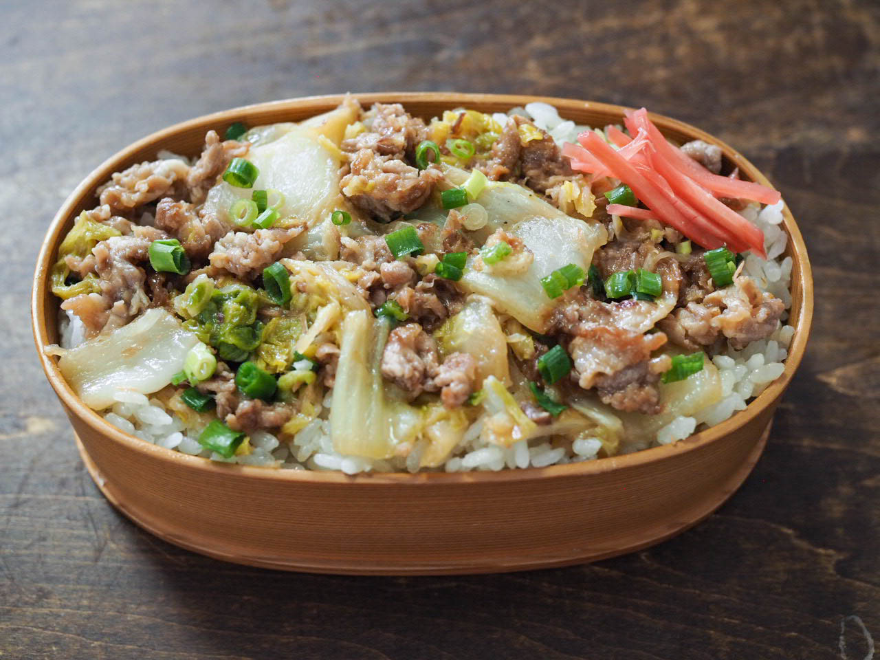 お弁当箱にご飯を詰め、その上に豚肉と白菜のやわらか煮をのせ、紅ショウガを添える。