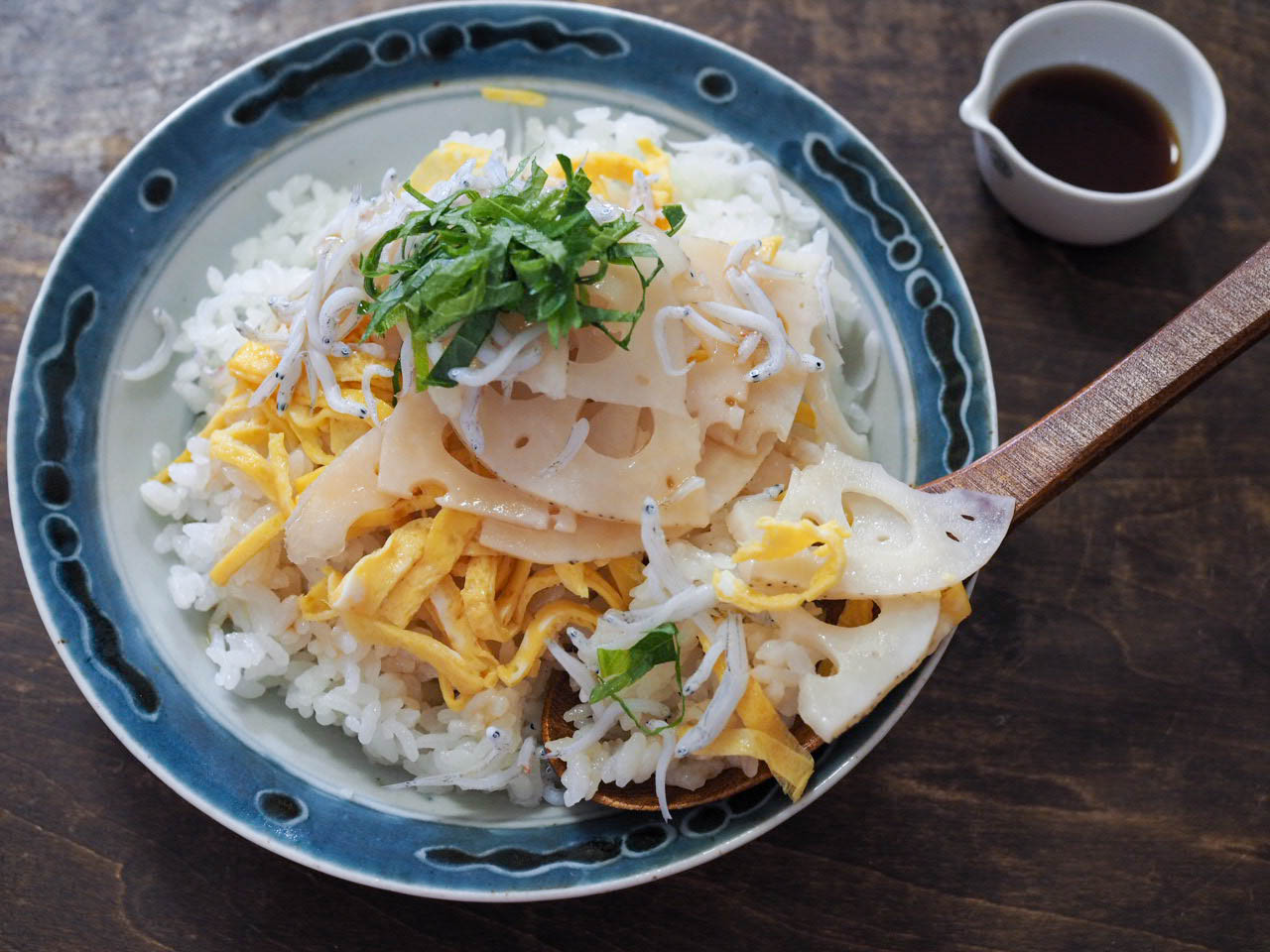 錦糸卵を作り、ご飯の上に錦糸卵、レンコンの甘酢漬け、しらす干し、青しそをのせ、食べる時にお好みでポン酢しょうゆをかける。