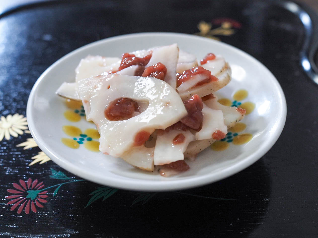 梅干の梅肉の部分をキッチンはさみで細かく切り、レンコンに混ぜる。