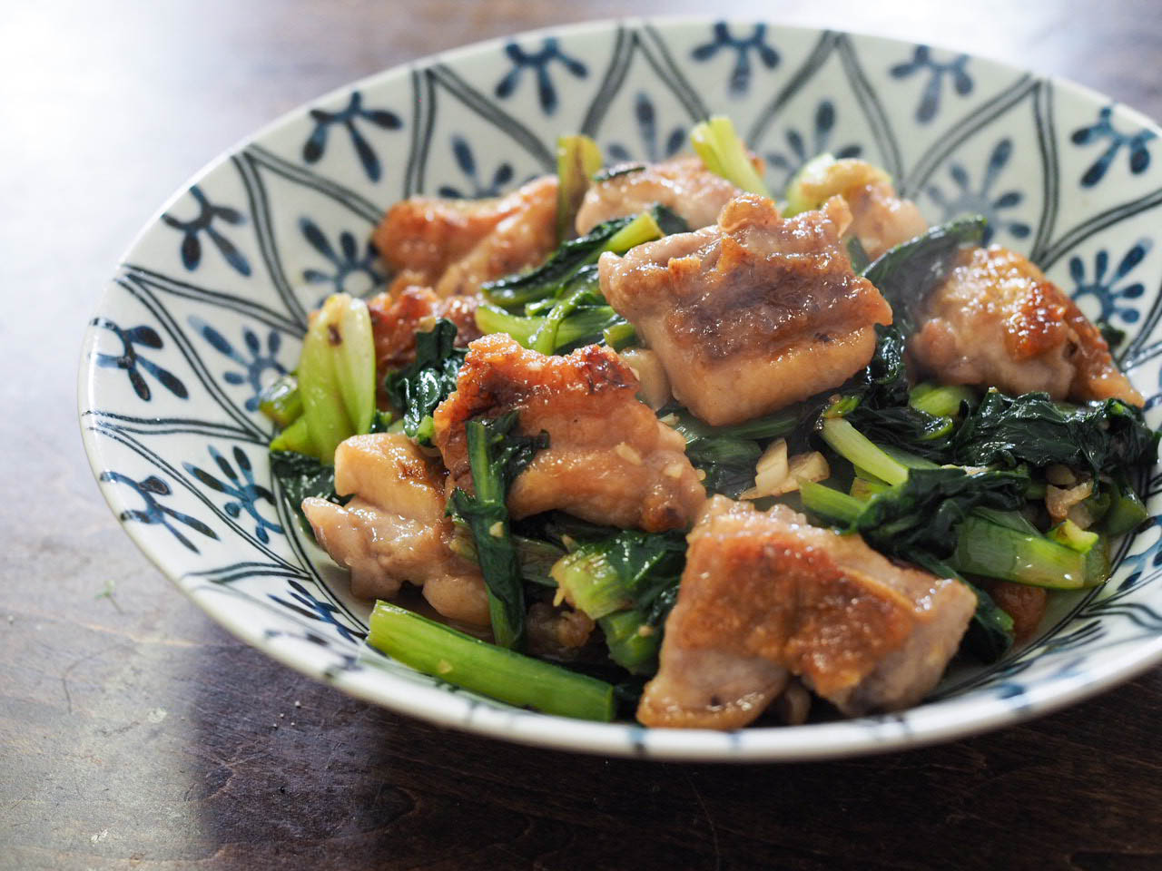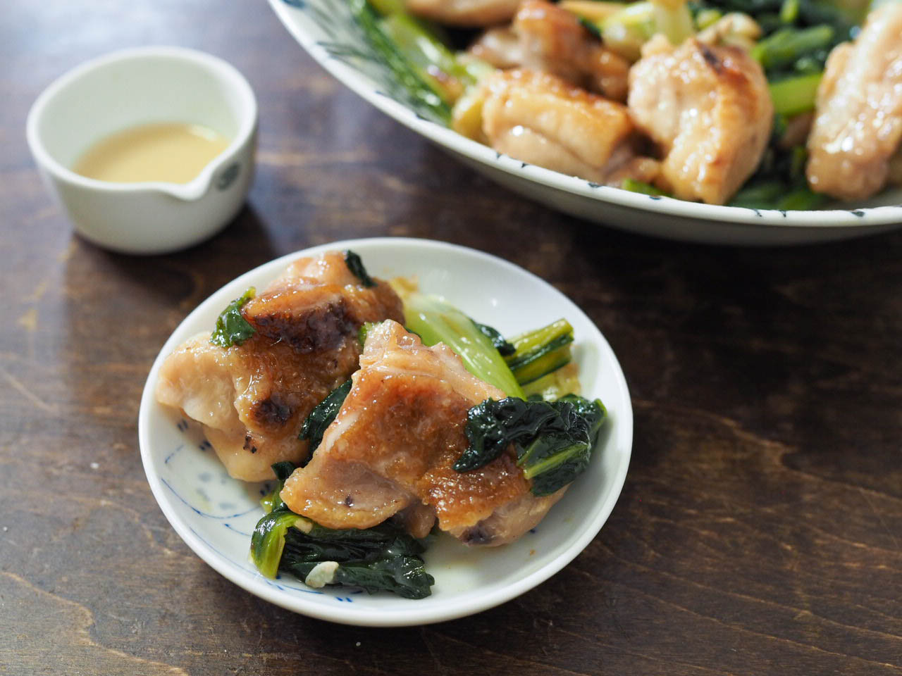 鶏もも肉の油のコクと小松菜がめちゃめちゃ合うの。