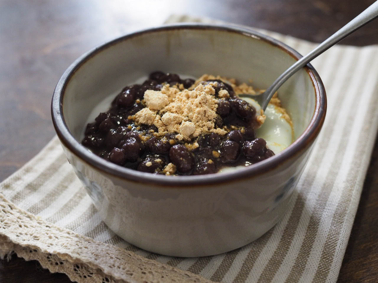 • 粗熱が取れたあんこをヨーグルトにのせ、お好みできなこもかける。