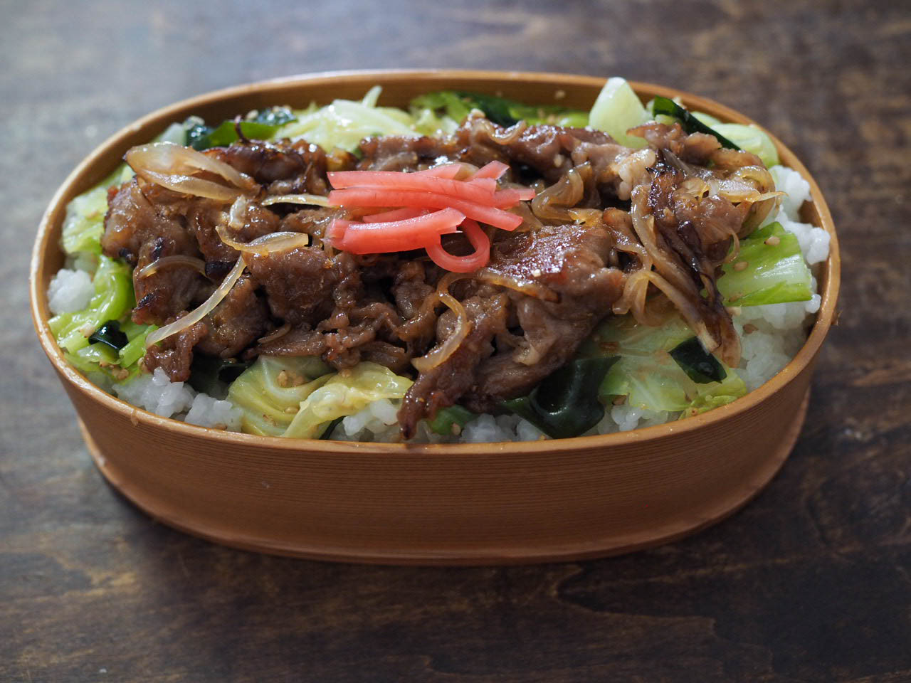 • お弁当箱にご飯を詰め、キャベツナムルを広げたうえに、豚肉の生姜焼きを広げ、紅しょうがをのせる。