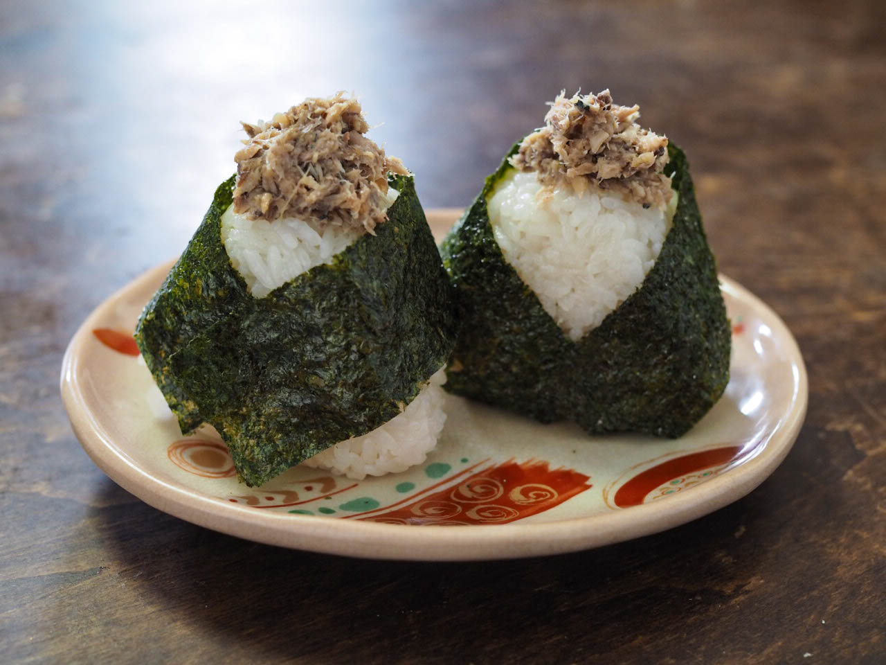出来上がったサバ缶そぼろを具にしておにぎりを作り、海苔で巻く。
